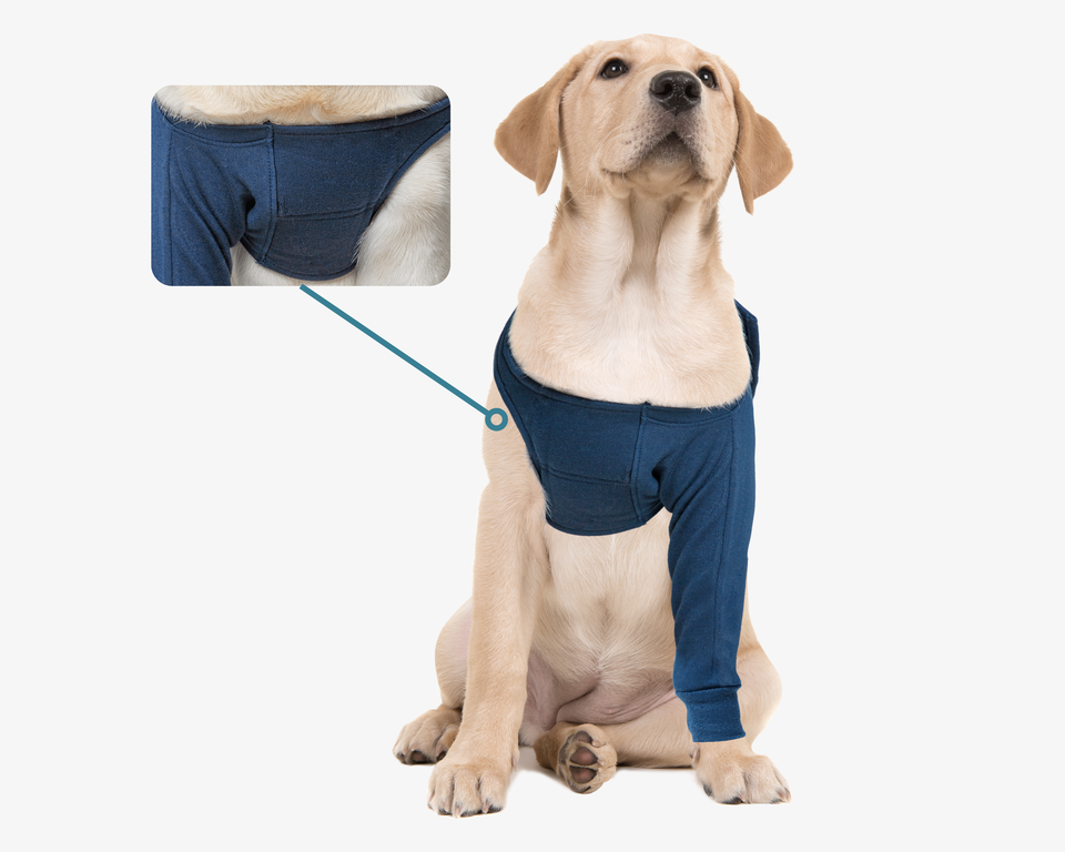 The sleeve is finished with extra-soft, thick elastic bands around the chest and leg. This protective trim helps prevent chafing, friction, and pressure points, even during longer use. Is the sleeve a bit long for a dog? Simply fold it up for a comfortable, customized fit.