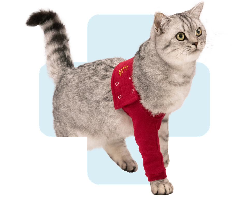 Een MPS Protective Front Leg Single Sleeve Kat is écht origineel wanneer je het gele MPS logo aan de rechterkant ziet. Elk legitiem product heeft bovendien een waslabel met een MPS hologram. Geen logo of hologram? Dan is het geen officieel product van Medical Pet Shirts Europe Int. wat betekent dat we geen garantie bieden op onze kwaliteit, veiligheid en pasvorm.
